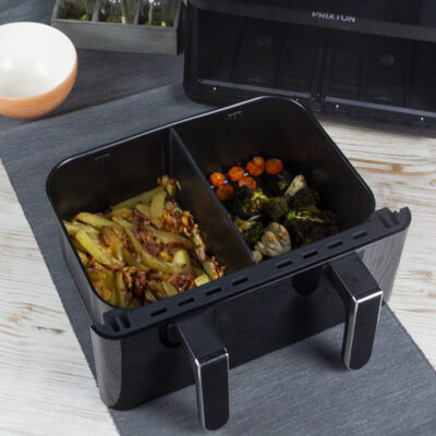 Además, si tienes que cocinar poca cantidad, podrás usar el separador y escoger usar únicamente un lado del cesto (de 4 L) y el otro, dejarlo apagado.