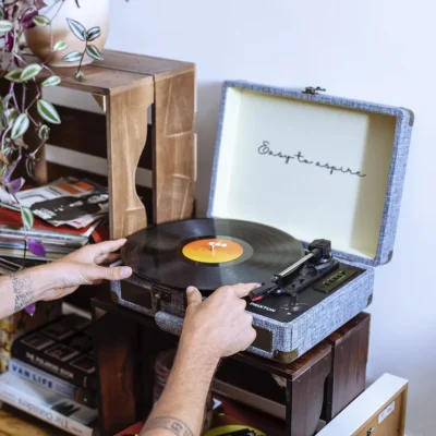 Me gusta coleccionar vinilos de mis grupos de música favoritos y no tenía tocadiscos. Este es muy buena opción. Es de tela gris y se cierra como si fuera una maleta. Lo mejor es que tiene bluetooth para poder conectar la música del móvil.