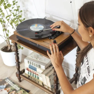 Disfruta de tus vinilos donde quieras gracias al tocadiscos Studio con diseño retro. Puedes digitalizar tus vinilos a través de la ranura MicroSD y USB. Además, si no tienes discos, ¡no hay problema! Puedes conectar tu móvil a través de la conexión inalámbrica y disfrutar de tus canciones favoritas.